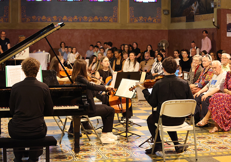 Dans cette église, première bâtie en France par les salésiens, les spectateurs ont pu assister à un spectacle offert par les élèves du conservatoire de la ville, avec l’intervention des collégiens et lycéens en option théâtre, en partenariat avec le théâtre national de Nice. Adiana Lina Bulducci, Clara Gonzalves et Louna Ouzebiha ont interprété Vers la source dans le bois de Marcel Tournier à la harpe ; Oleksii Kovtun et Grégoire Carmelo interprétaient, au violon et au piano, le Blues de Maurice Ravel ; au violon, Alma Hontensche et Paul Bednarczyk, avec Naïs Metiverragonnet à l’alto, Pauline Creissen au violoncelle et Angelo Balducci ont joué une Quinquette de Johannes Brahms ; Paul Salard, ancien élève de Don Bosco et finaliste lauréat du concours européen Young Pianist Foundation, a conclu la soirée musicale au piano en jouant la Marche Turque de Mozart. La soirée était entrecoupée de textes récités par les élèves en option théâtre, parlant avec brio de l’importance de la musique, de la joie, de Don Bosco… Et pour rendre hommage à la passion du saint éducateur pour le cirque et les jeux d’adresse et d’équilibre, Thomas Lasne, de l’école du cirque de Tourrettes-Levens, a réjoui l’assistance avec des jongleries.