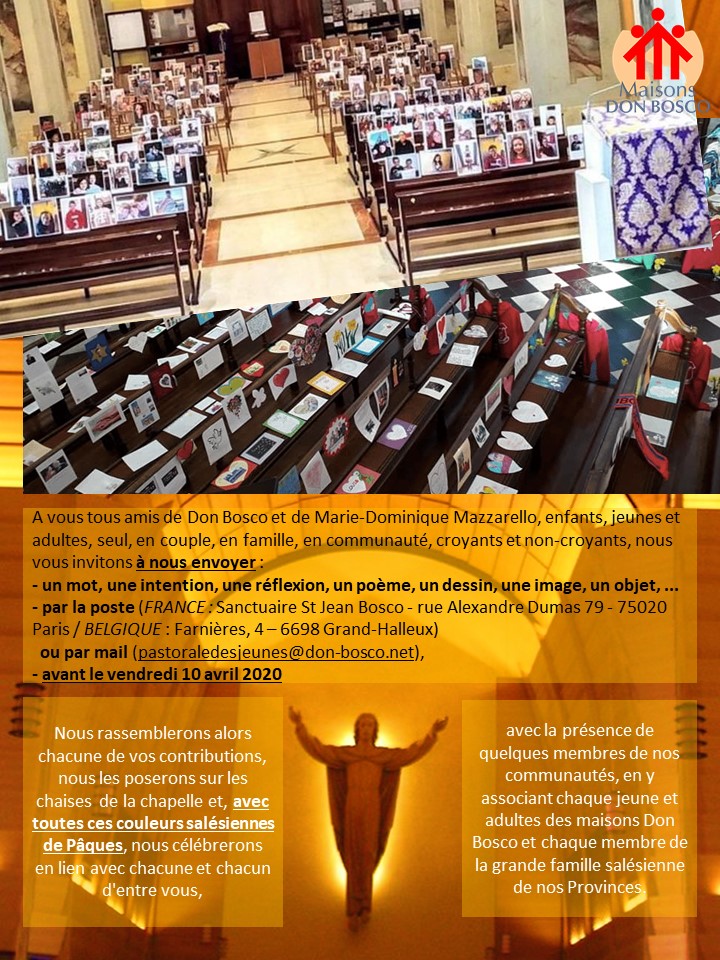Nous rassemblerons alors chacune de vos contributions, nous les poserons sur les chaises de la chapelle de Farnières ou du Sanctuaire St Jean Bosco de Paris et, avec toutes ces couleurs salésiennes de Pâques, nous célébrerons en lien avec chacune et chacun d’entre vous, avec la présence de quelques membres de nos communautés, en y associant chaque jeune et adultes des maisons Don Bosco et chaque membre de la grande famille salésienne de nos Provinces.